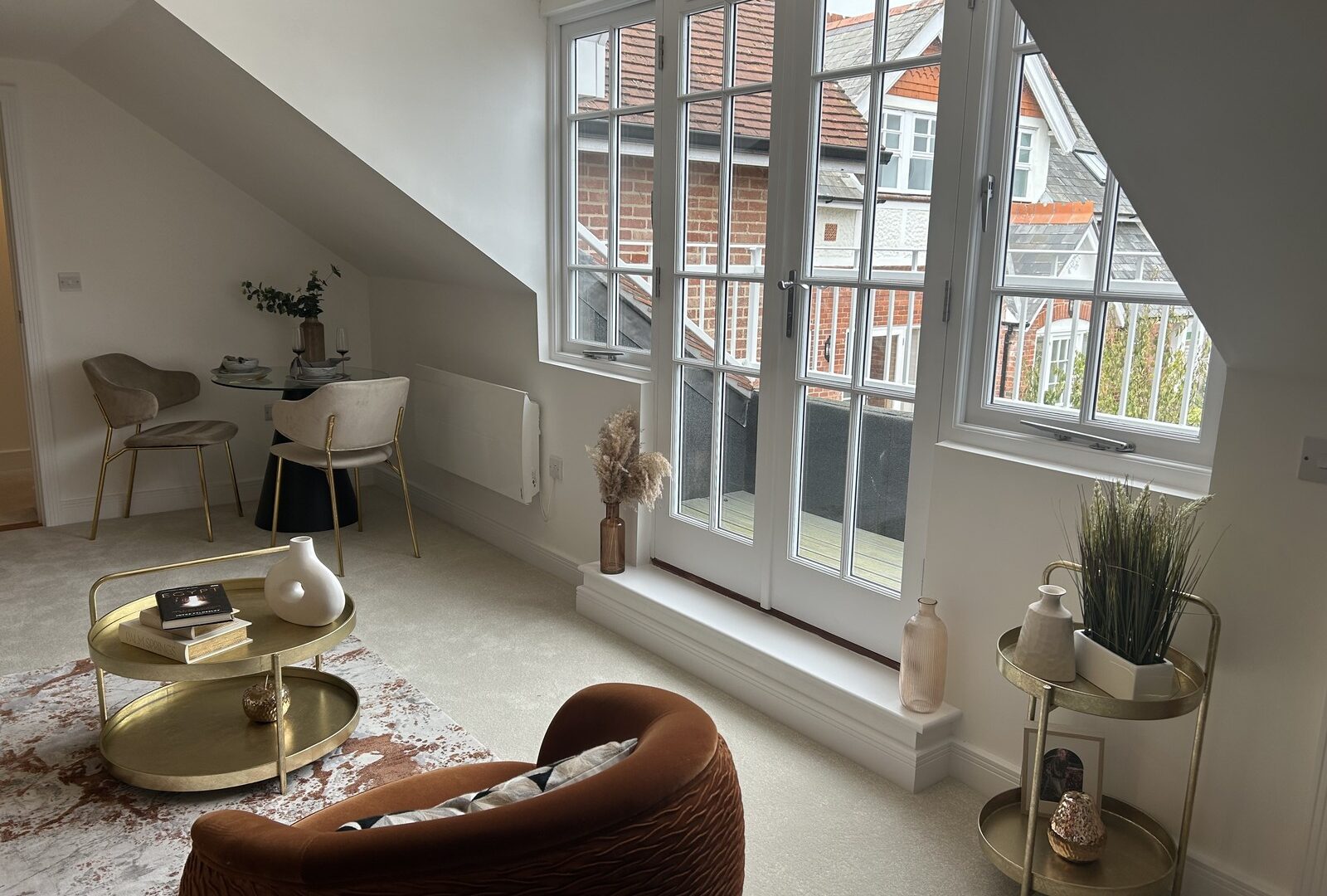 Discover this beautifully converted two-bedroom first-floor apartment in a newly refurbished historical building. Step into an inviting open-plan living area with a cosy living and dining room, well-lit by large windows and double doors leading to a balcony.