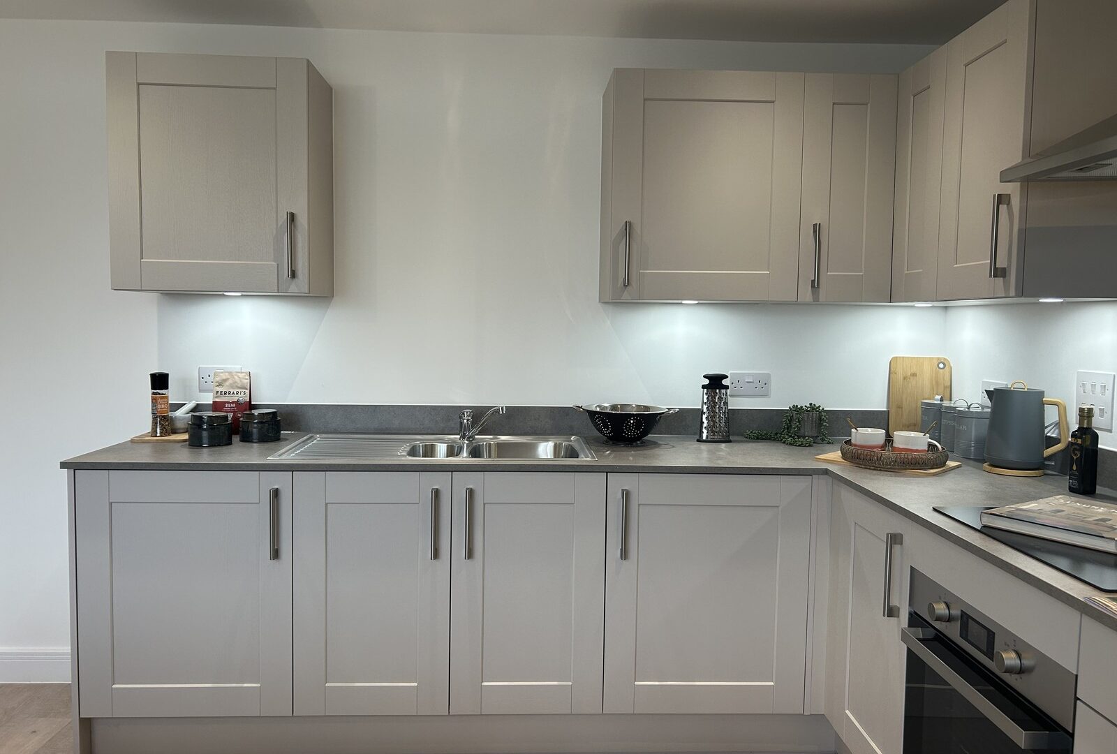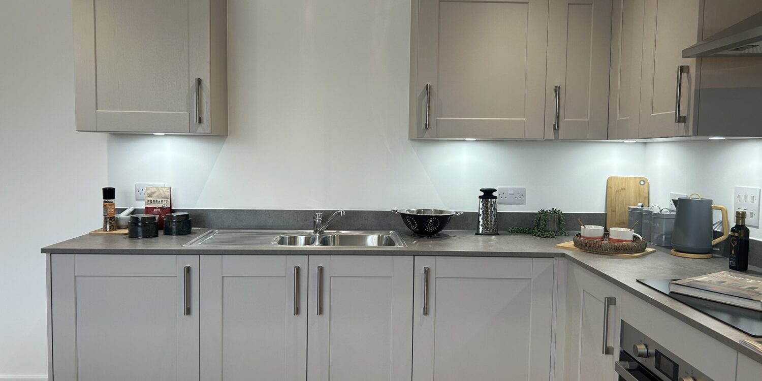- Laminate square edge worktop with matching upstand, with glass splashback in the kitchen