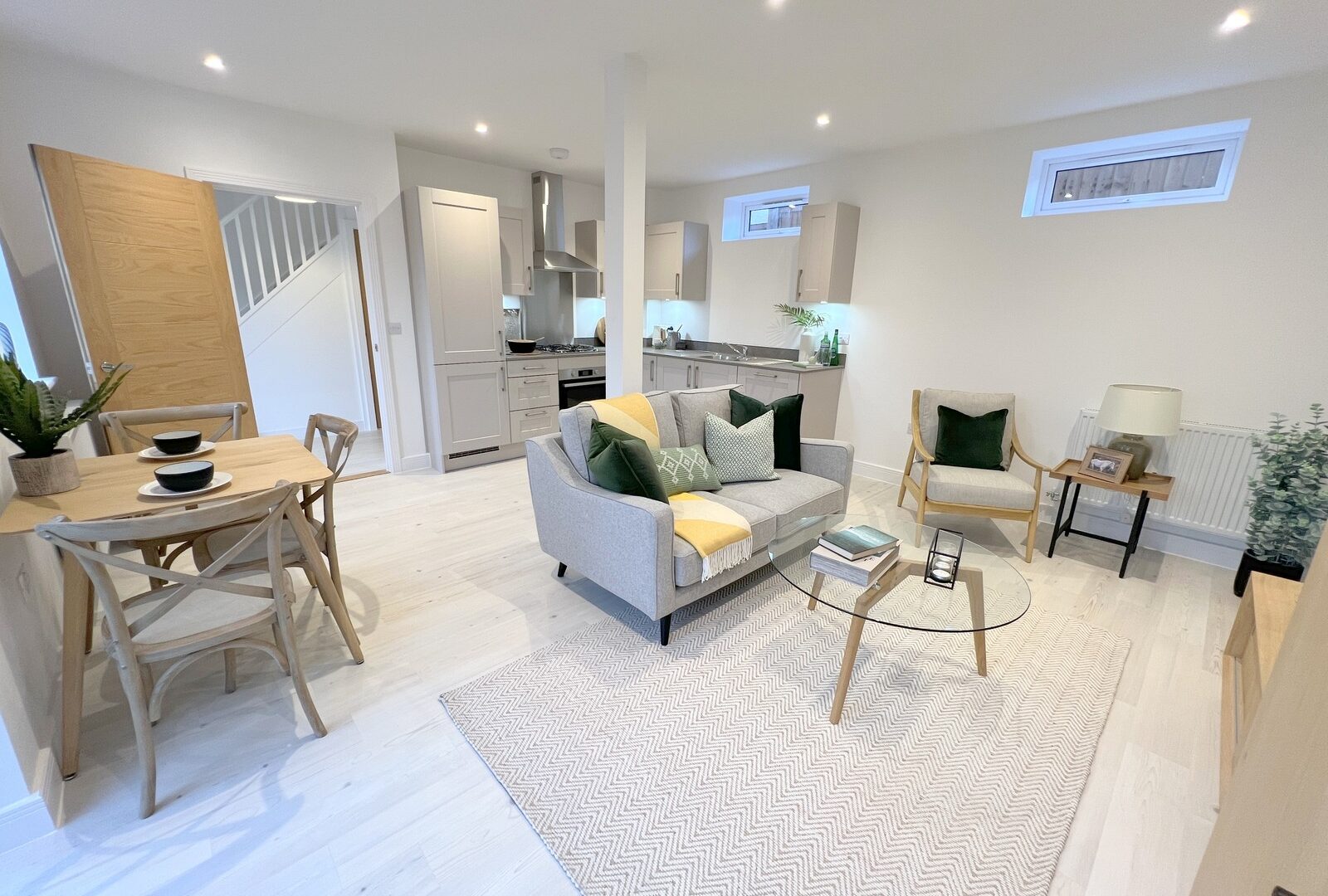 Good sized entrance hall with double glazed front door, stairs to the first floor and useful understairs storage cupboard. Fantastic living/dining/kitchen area with casement door onto the private garden, recess ceiling spotlights and a superb kitchen area with a range of light grey timber effect wall and base units with a marble effect worktop, a range of built in appliances, recess ceiling spotlights and an extractor fan.