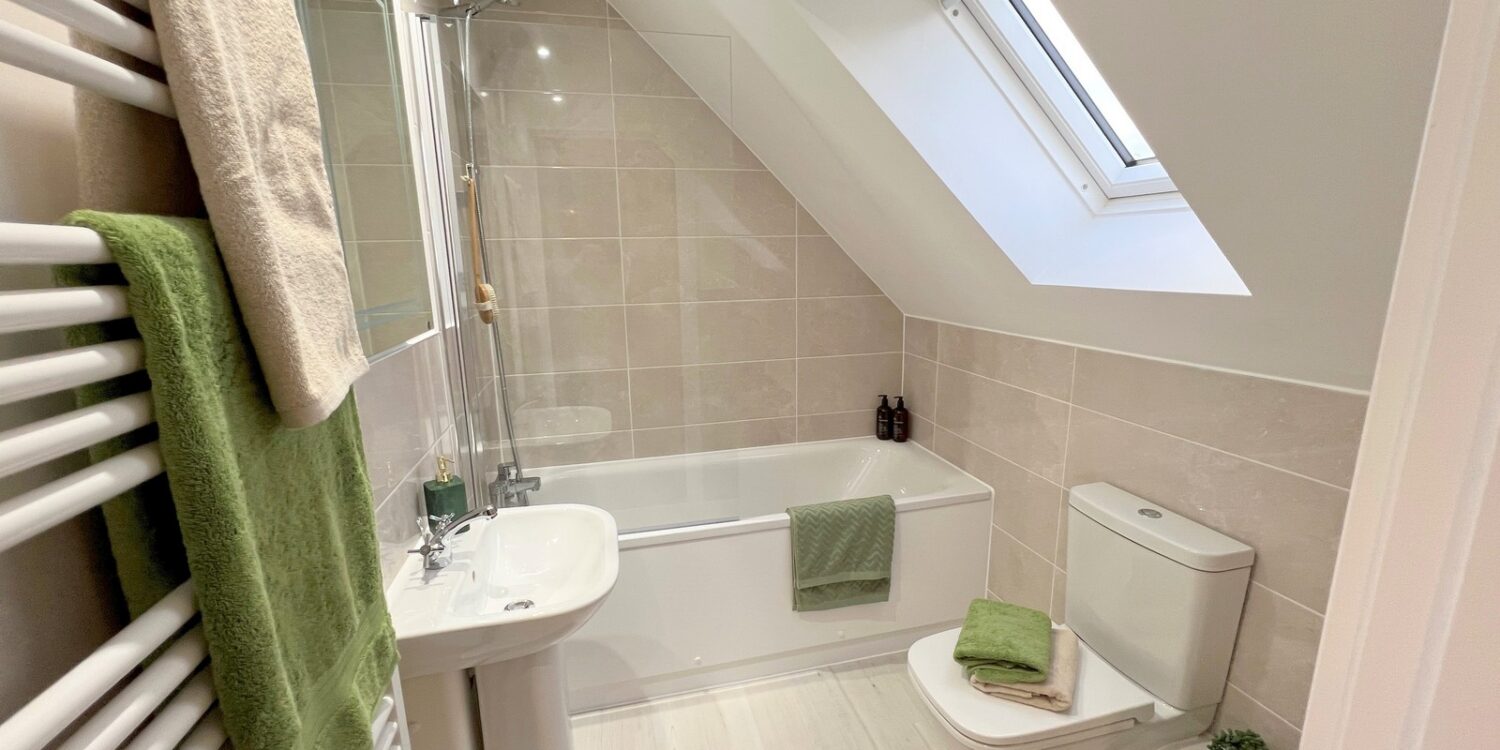 To the First Floor, the landing features a double glazed Velux window and double airing cupboard, a luxury bathroom fitted with a white suite and attractive wall titling, recess ceiling spotlights and an extractor fan.