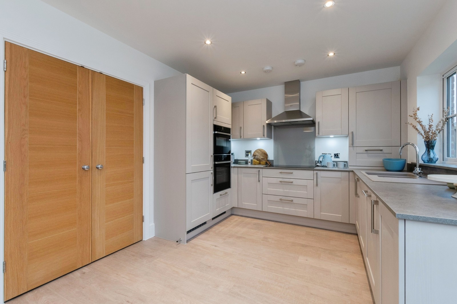 - Oak-faced doors with contemporary polished chrome lever handles.