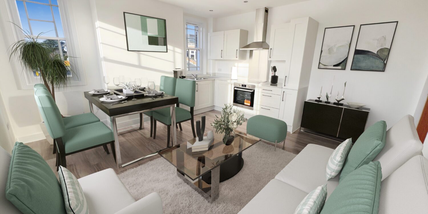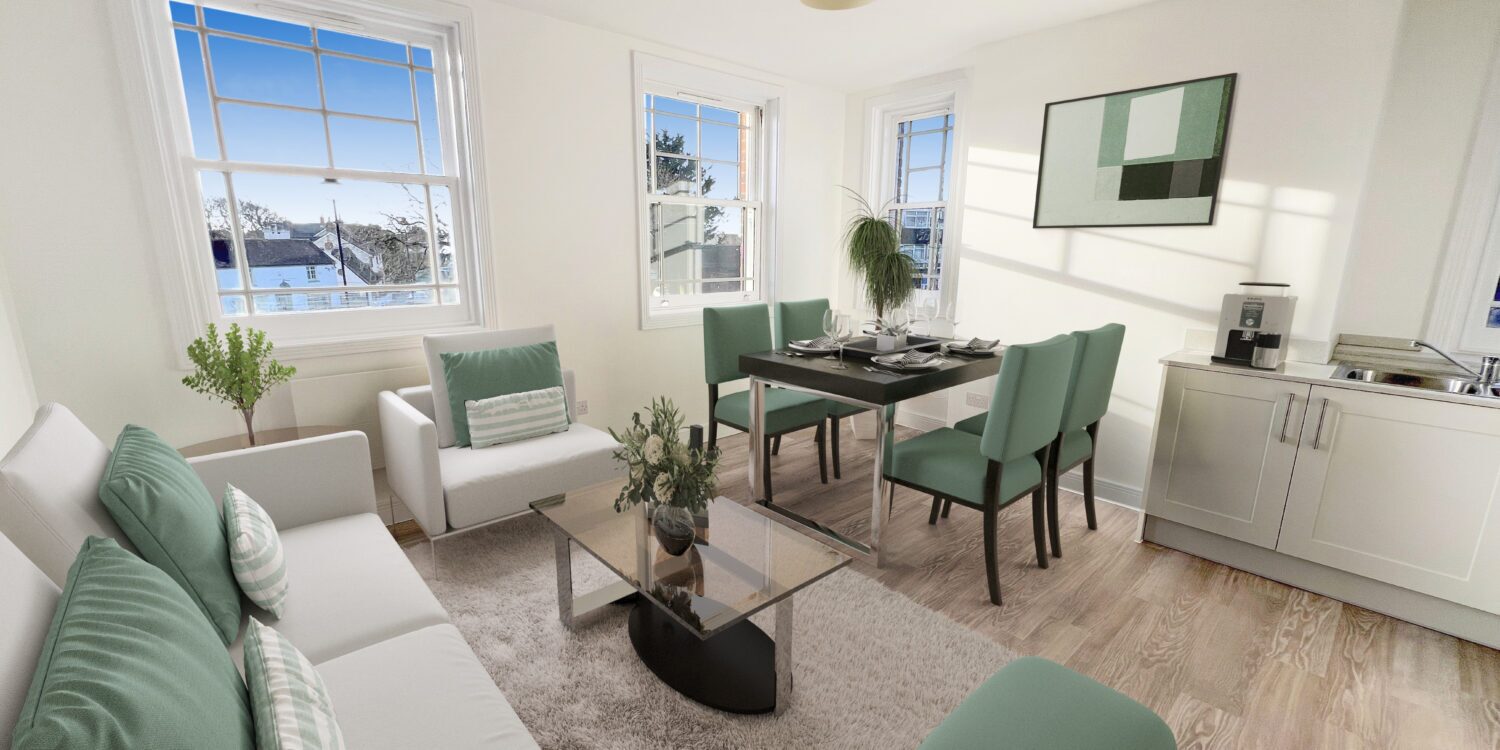 Discover a delightful one-bedroom first-floor apartment in a beautifully converted historical building. This home welcomes you with an entrance hall that leads into a spacious open-plan living area, combining a cosy sitting room, a dining space, and a well-equipped kitchen. The apartment features elegant oak doors throughout, adding to the character.