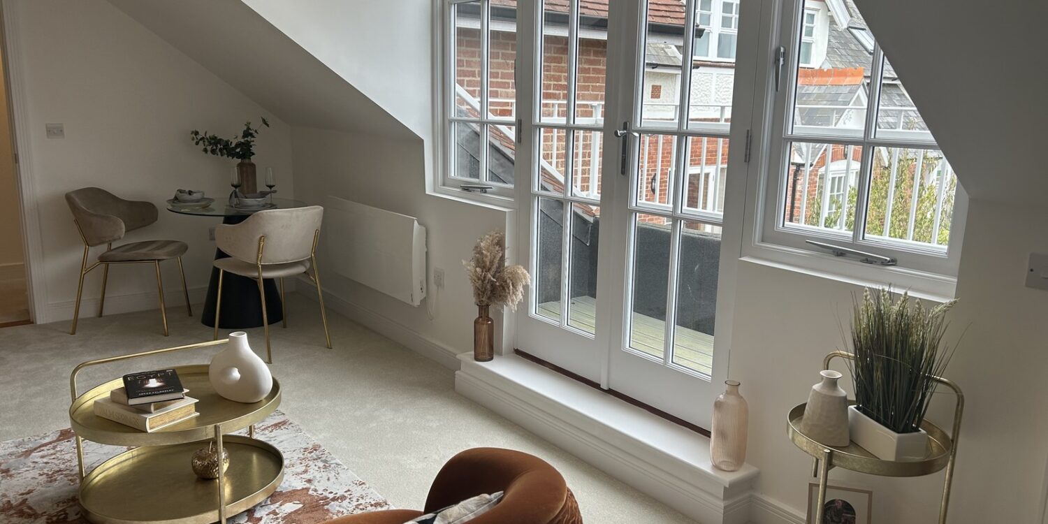 Discover this beautifully converted two-bedroom first-floor apartment in a newly refurbished historical building. Step into an inviting open-plan living area with a cosy living and dining room, well-lit by large windows and double doors leading to a balcony.